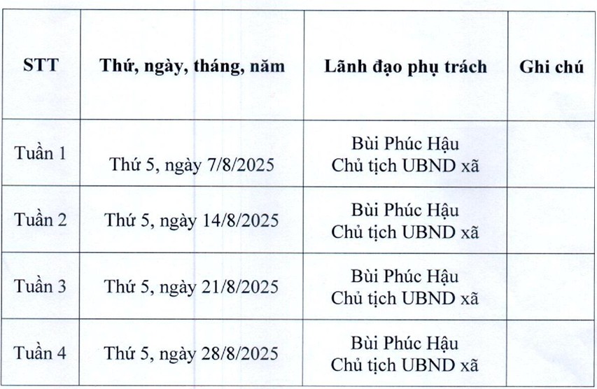 LỊCH TIẾP CÔNG DÂN THÁNG 8/2025 CỦA UBND XÃ